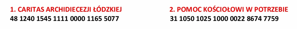 Numery kont bankowych organizacji charytatywnych czyli łódzkiej Caritas i Papieskiego Stowarzyszenia Pomoc Kościołowi w Potrzebie.